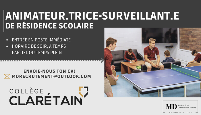 | Animateur.trice de résidence scolaire - Collège Clarétain - Victoriaville |  |